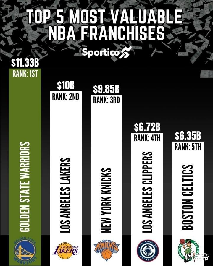 30个球队里,目前总市值第一的是金州勇士113.3亿美元,排名第二的是洛杉矶湖人100亿美元,排名第三的纽约尼克斯98.5亿美元,前三名是断层领先的,而且勇士已经连续5年第一了。排名第四的是67.2亿美元的快船,排名第五的是63.5亿美元的凯尔特人。