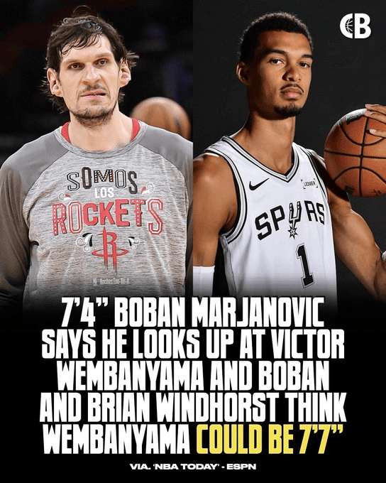 正如那条推文所说,ESPN的布莱恩·温德霍斯特认为温班亚马的身高可能高达7尺7英寸(约2.31米)。