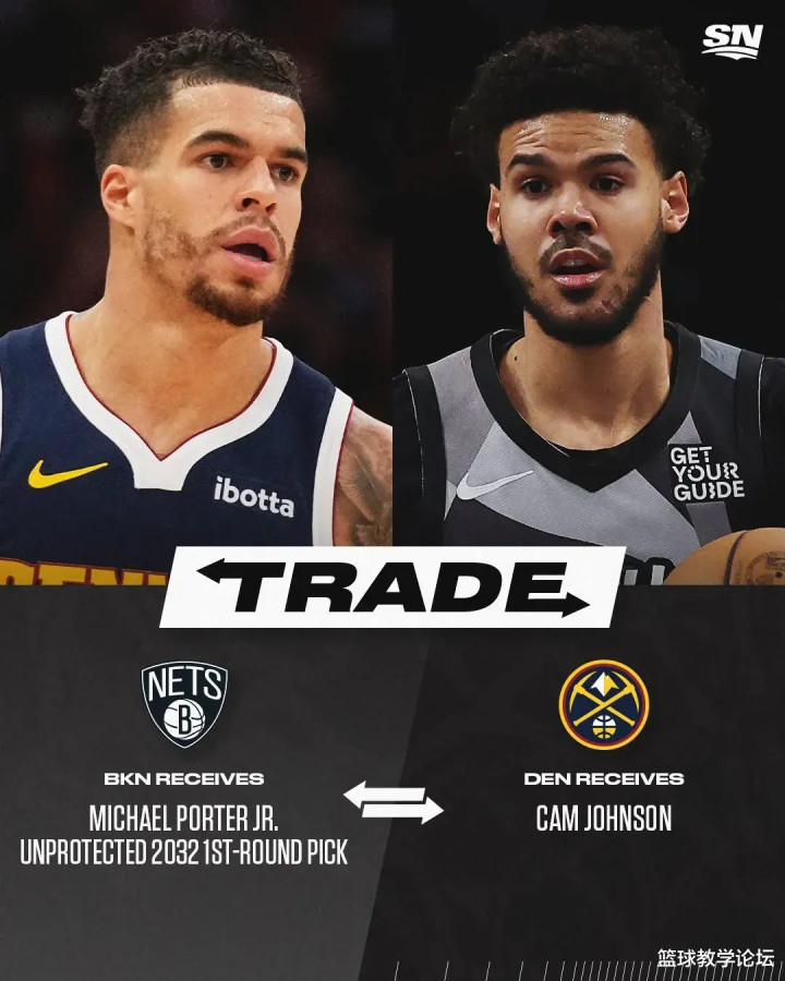NBA记者Law Murray发文写道:“如果小波特打卡梅伦-约翰逊的数据,外界批评肯定会多好几倍!”为啥要对比他俩的数据?今年夏天,掘金把小迈克尔-波特和1个2032年无保护首轮签送到篮网,2换1交易得到卡梅伦-约翰逊。