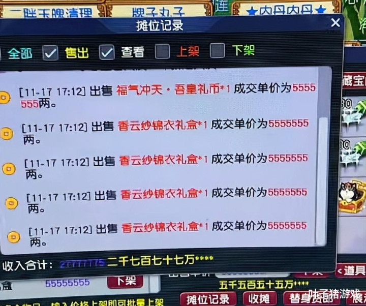 摆摊手滑是一种怎样的体验?一位礼盒商人就因此付出了沉重代价。在出售吾皇祥瑞和水云归锦衣时,他不慎将价格少打一个零,以555万梦幻币的单价售出5套,直接造成近2.5亿的损失!