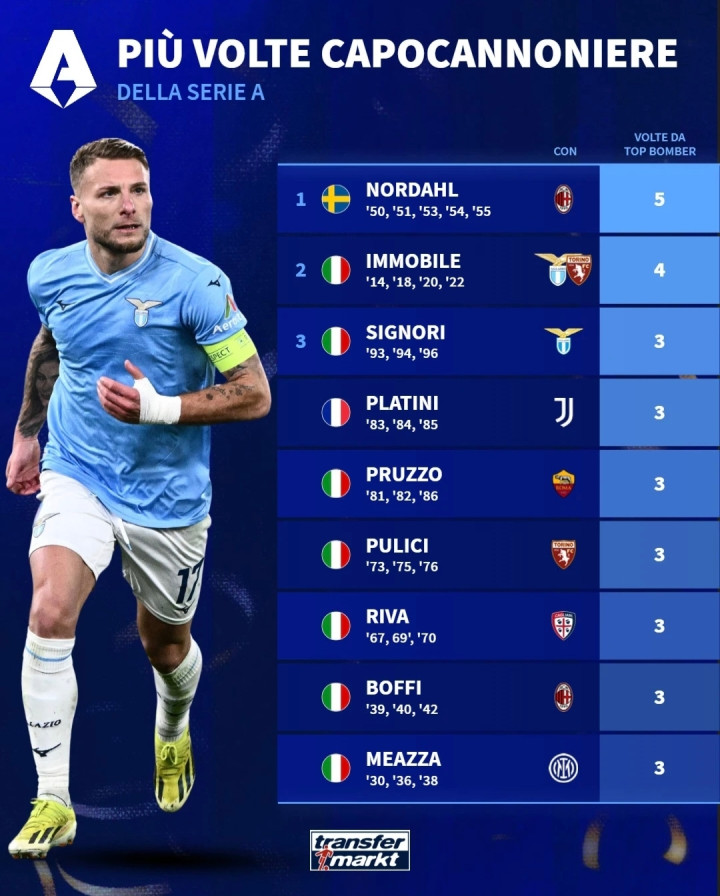 在现役球员中,除了因莫比莱之外,迪巴拉以130球排名第二,126球的贝拉尔迪和124球的萨帕塔分列三、四名,劳塔罗的122球可以排在第五名。在意甲联赛历史上,因莫比莱曾在效力都灵和拉齐奥期间四次获得联赛最佳射手,获得联赛最佳射手的次数仅小于上世纪50年代在AC米兰五获金靴的瑞典前锋诺达尔。另外曾有7名球员曾3次获得意甲联赛最佳射手,分别是:西格诺里(拉齐奥)、普拉蒂尼(尤文图斯)、普鲁佐(罗马)、普利奇(都灵)、里瓦(卡利亚里)、博菲(AC米兰)和梅阿查(国际米兰)。