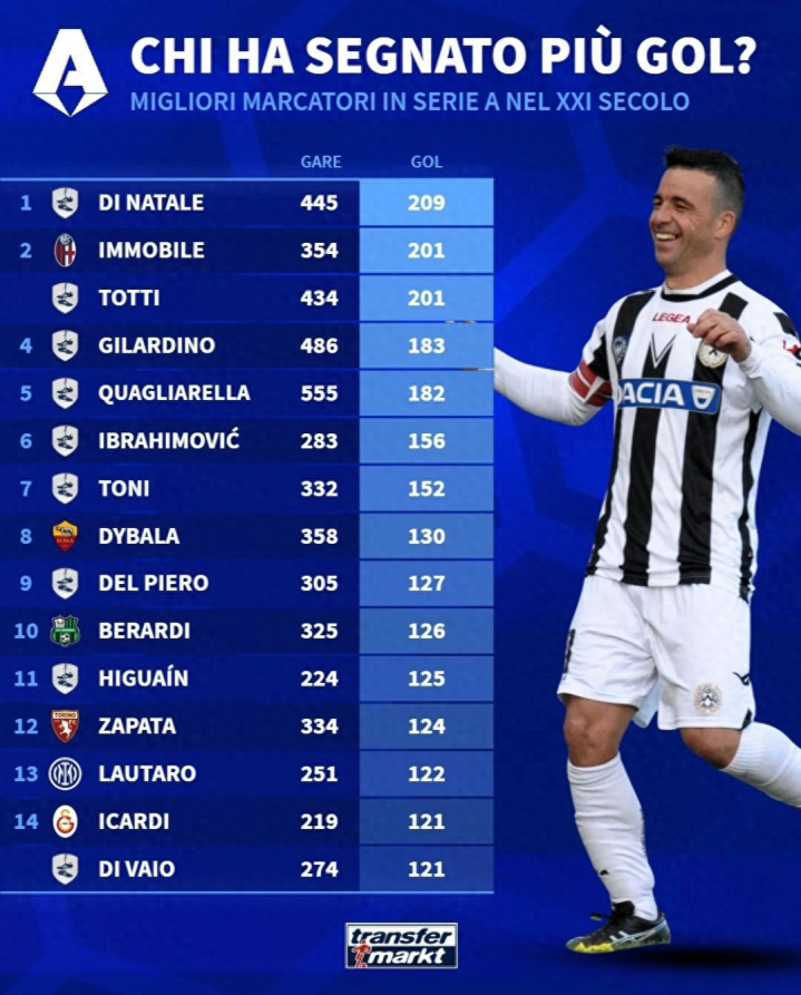 本世纪意甲联赛射手榜如下,乌迪内斯队史最佳射手迪纳塔莱以445场209球排名第一,因莫比莱与托蒂以201球并列第二,不过需要说明的是托蒂在意甲联赛中的总进球为250球,其中21世纪的进球是201球。